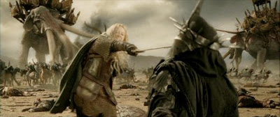 In the scene this giant, demonic dragon-like creature comes to feast on the flesh of the Eowyn’s wounded, fallen uncle, in the midst of a mammoth battle. Eowyn sees what’s about to happen and runs between the giant monster and her fallen king, holds up a broken weapon and defies the monster with, “I WILL KILL YOU IF YOU TOUCH HIM!” The demon-thing riding the monster simply says in response, “Do not come between a Nosgul and his prey.” The monster then lunges forward to feast on flesh and Eowyn decapitates the beast! When the evil lord dethrones his fallen beast and attempts to crush Eowyn with an iron slinging thing, she falls on top of her king. The evil lord then grabs her by the throat and says, “You fool! No man can kill me!” With that Eowyn removes her armor helmet, revealing that she’s a woman (who by the way was not supposed to be in the battle but snuck in anyway), and says, “I am no woman!” With that she slays the evil dude!