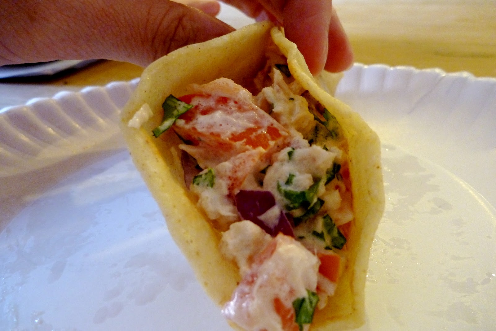 Mix 1 can of tuna with mayo, onion, tomatoes, cilantro and lime juice. Heat corn tortillas until slightly crisped in a tablespoon of oil. Scoop 3 T. tuna mix into corn tortilla. Enjoy!