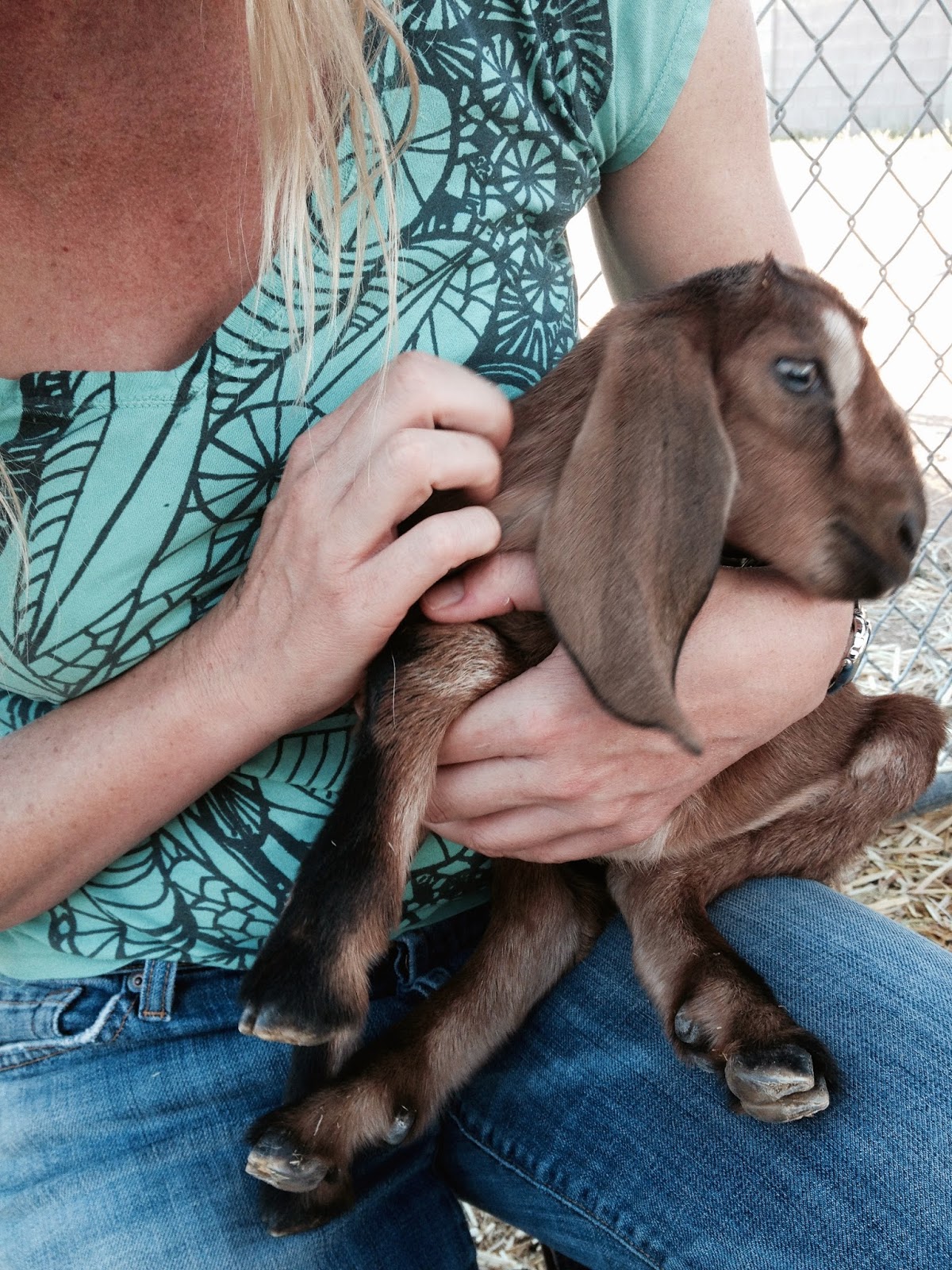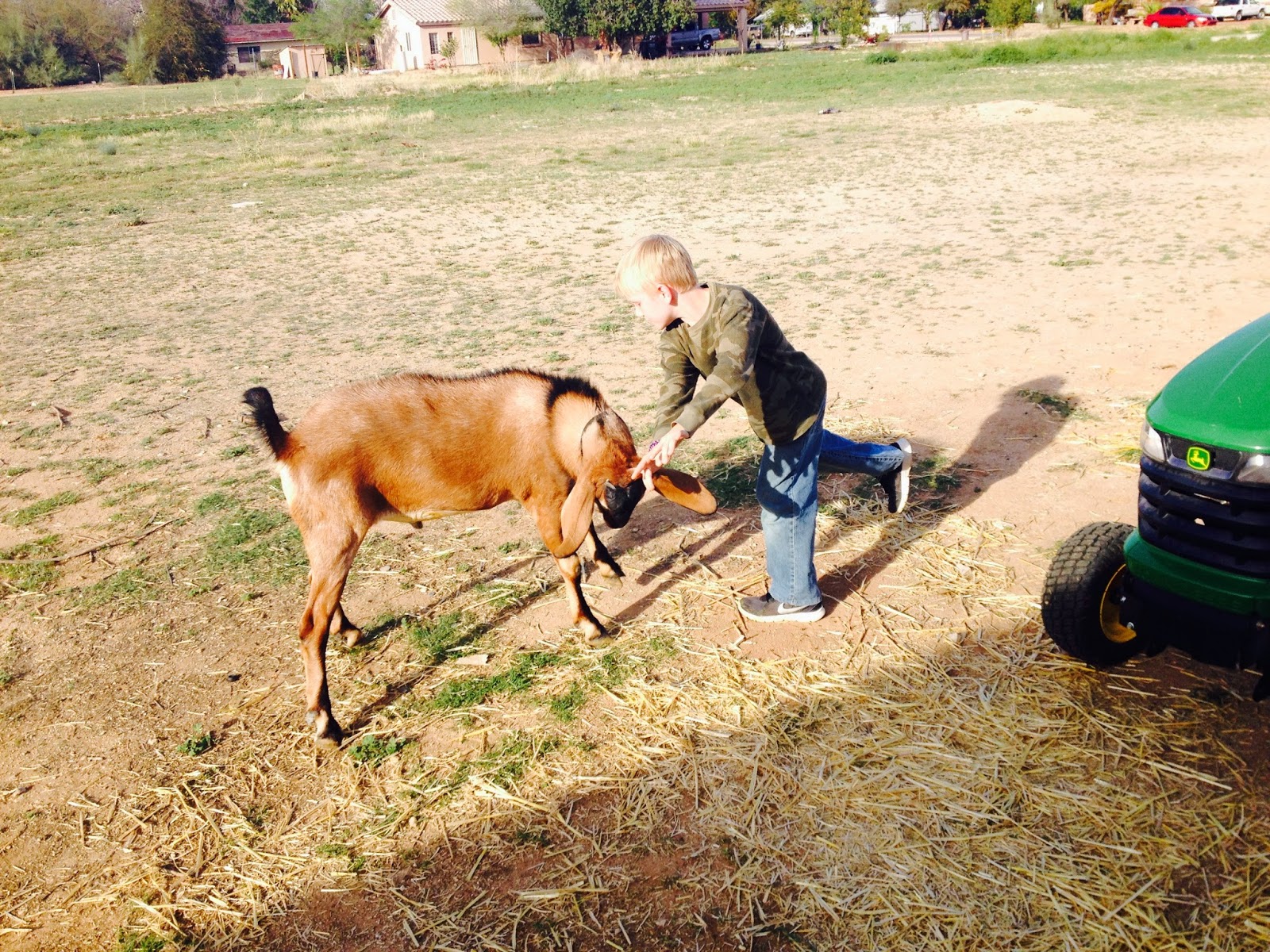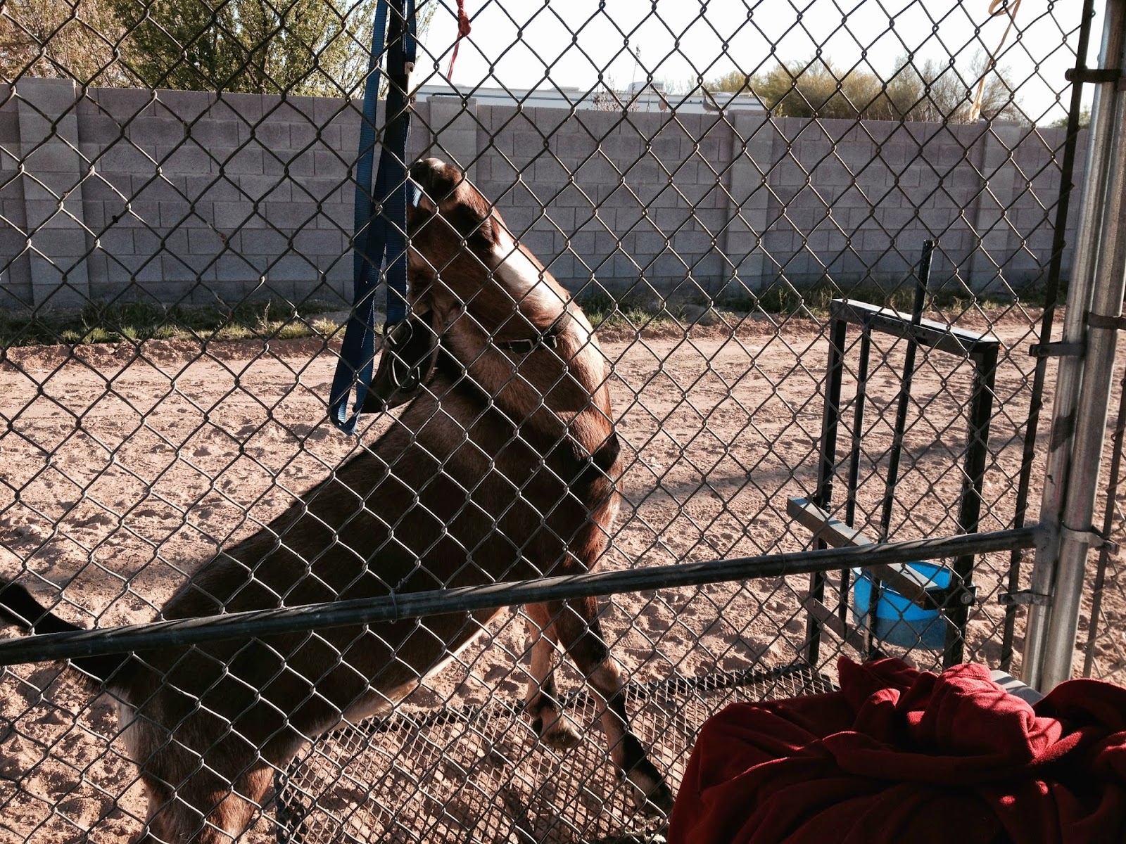 The momma goat, Darla, is doing a fine job for a first time mom. She leads her kids out of the pen twice a day and runs around with them for a little exercise. She baaas at them and they baaa back. She sniffs their tails and nudges them in the butt when she wants them to move. And she’s very protective of them! She’s head butted Bailey, our 10 year old female Lab twice for getting a little too close.